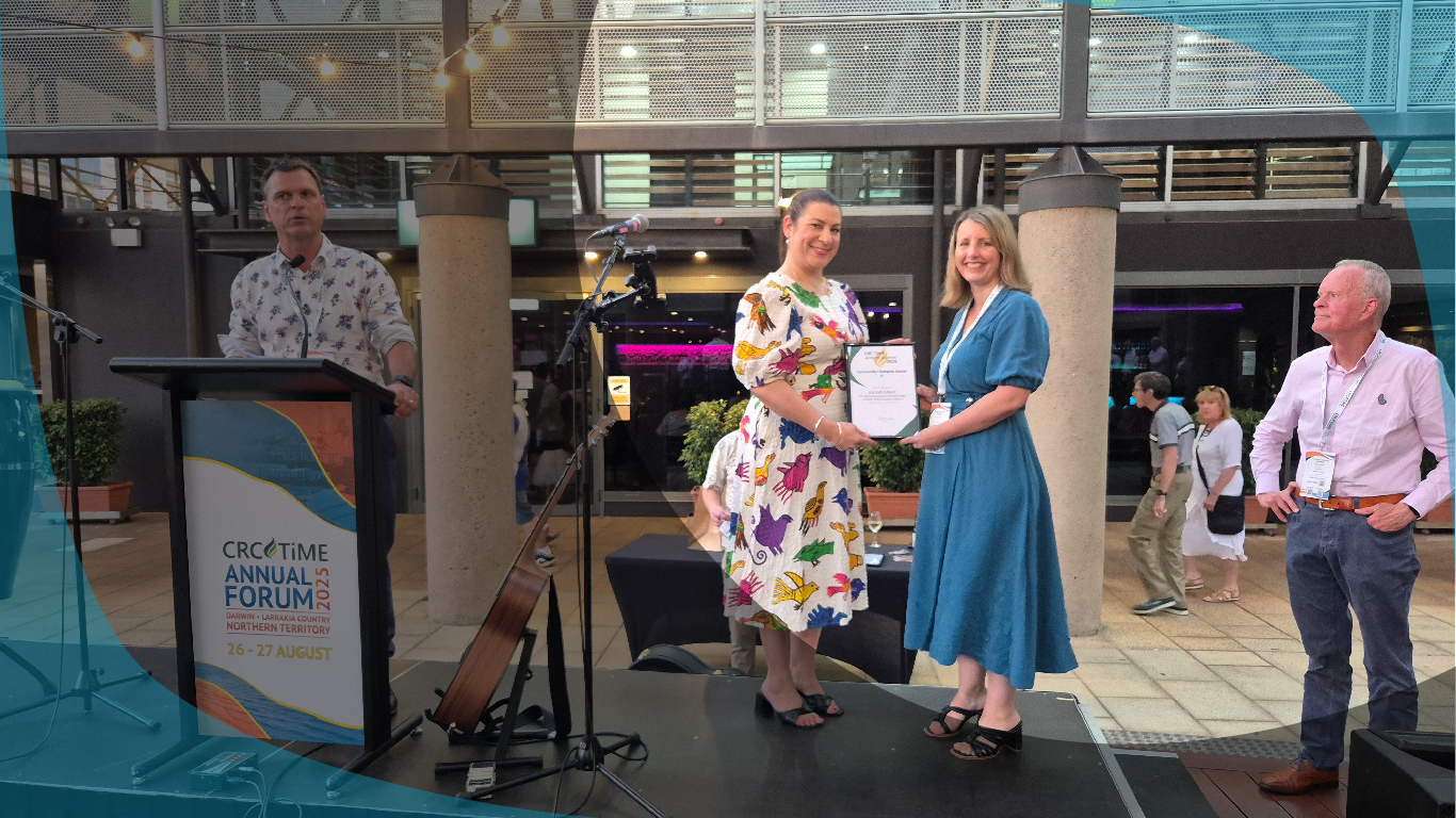 The award recognised her leadership and contributions through the Decarbonisation Accelerated Project and was presented at the CRC TiME Annual Forum Dinner in Darwin recently.